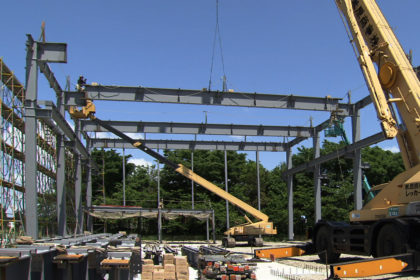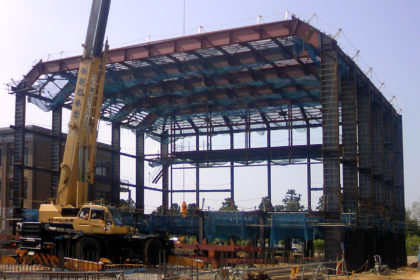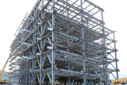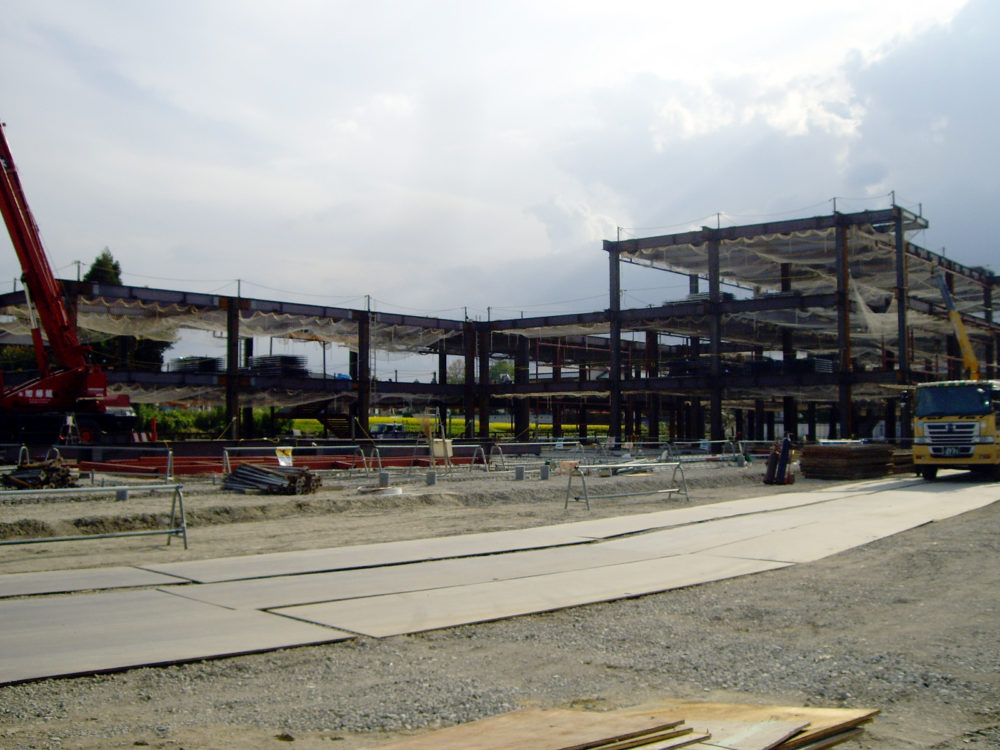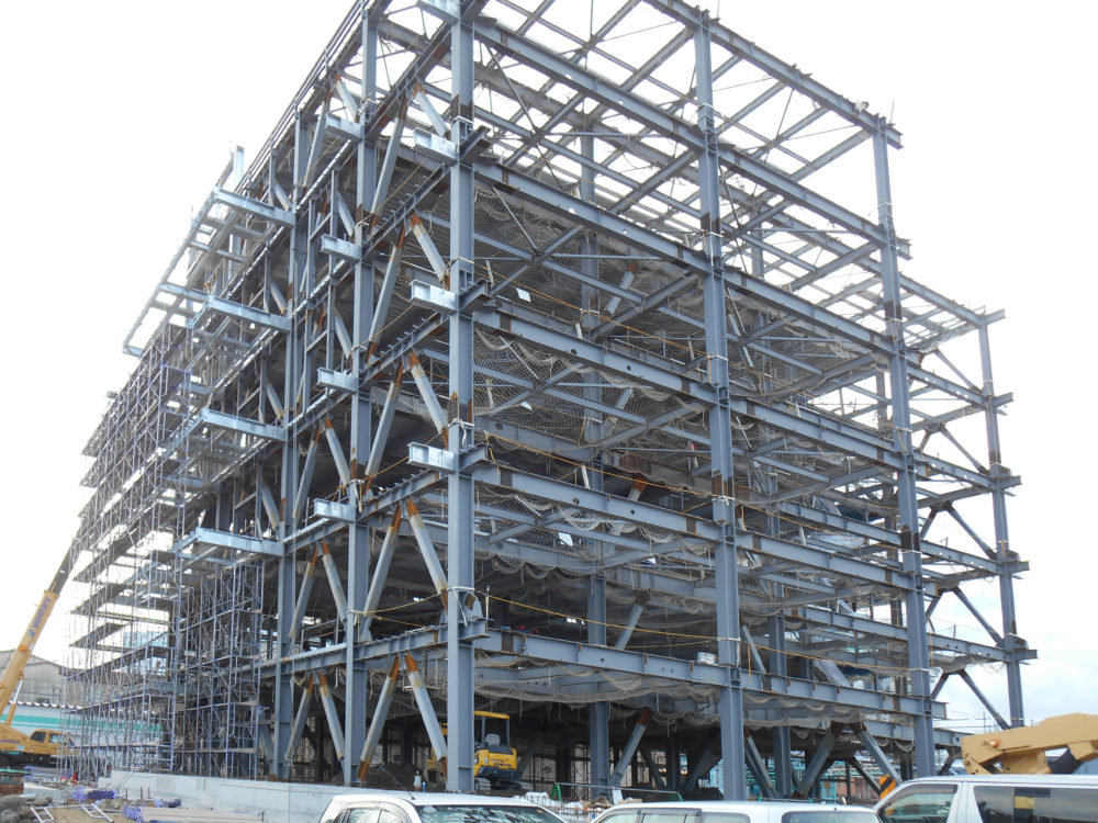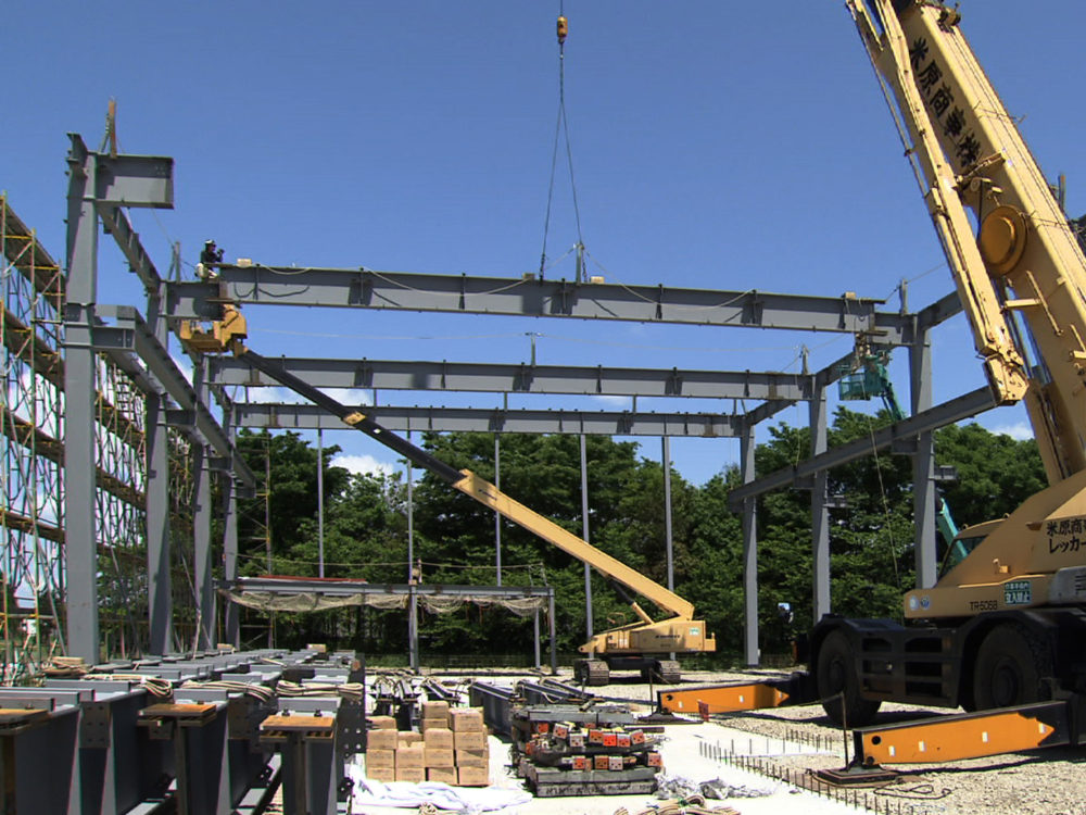 鋼構造物工事業は、鉄骨工事を主体として鐵構部が施工図作成から建方までを行います。鐵構部は工務課と製造課に分かれており、施工図作成・現場打合せ・材料発注・現場手配を工務課が、工場製作・現場建方を製造課が行っています。工務課では、現場からの細かい変更にも素早く対応できるよう、工事ごとに担当者が決まっており、現場打合せから施工図作成、材料発注までを行い、社内における連絡漏れや伝達ミス等を最小限におさえています。